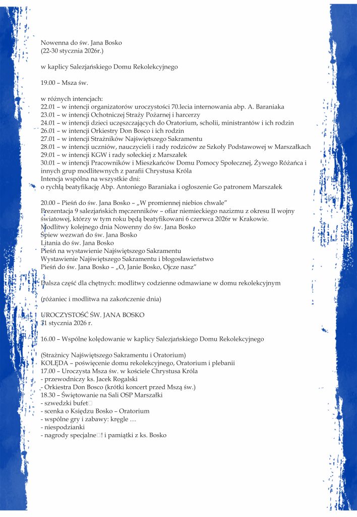 3. Aktualnie przeżywamy 70-tą rocznicę internowania arcybiskupa Antoniego Baraniaka, który wtedy został przewieziony do Marszałek. Wystawa dotycząca arcybiskupa odwiedza kolejne parafie. Była w Parafii Miłosierdzia Bożego w Ostrowie Wielkopolskim, obecnie jest w Parafii Matki Bożej Fatimskiej w Ostrowie Wlkp., w której 8-11 marca 2026 odbywają się rekolekcje wielkopostne.