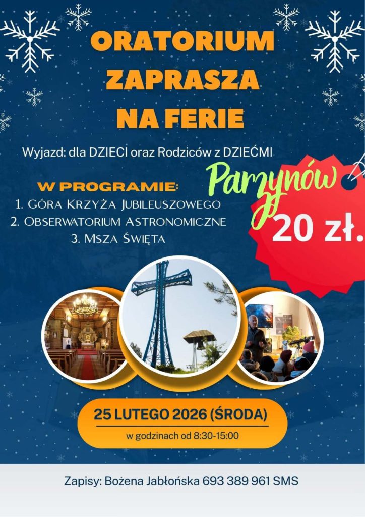 1. W środę 18-02-2026 zamiast spotkania w Oratorium, po Koronce do Miłosierdzia Bożego odbędzie się Msza Święta z posypaniem głowy popiołem. Zapraszamy dzieci z rodzicami.